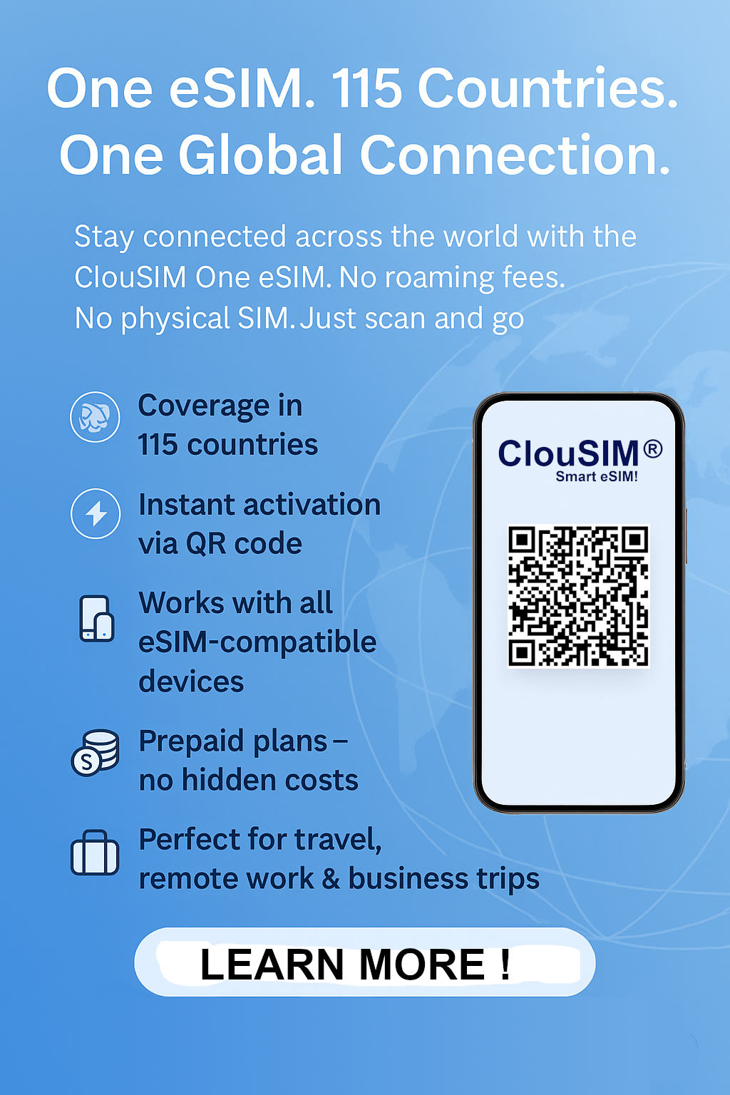 ClouSIM enables instant worldwide mobile internet access. Activate one of our data packages with the integrated eSIM chip on your smartphone, using your existing SIM card.